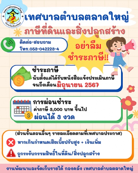 การชำระภาษีที่ดินและสิ่งปลูกสร้าง ประจำปี 2567 โปรดชำระภายใน เดือนมิถุนายน พ.ศ .2567 จ่ายช้ามีค่าปรับและเงินเพิ่ม หากไม่ติดต่อชำระภายใน เดือนมิถุนายน 2567 ตามรายละเอียดด้านบนนี้