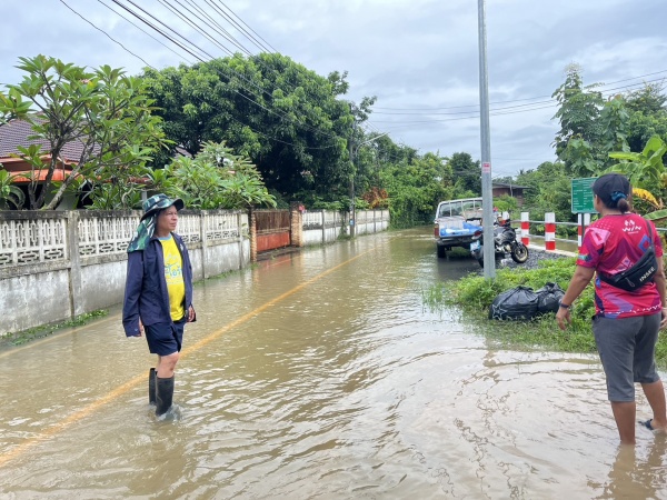 นายกฯ และเจ้าหน้าที่เทศบาล ลงพื้นที่น้ำท่วมและให้ความช่วยเหลือประชาชนโดยการนำกระสอบทรายกั้นทางน้ำในพื้นที่ตำบลตลาดใหญ่โดยเร่งด่วน