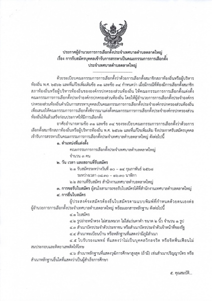 ประชาสัมพันธ์ เรื่อง การรับสมัครบุคคลเข้ารับการสรรหาเป็นคณะกรรมการการเลือกตั้ังประจำเทศบาลตำบลตลาดใหญ่