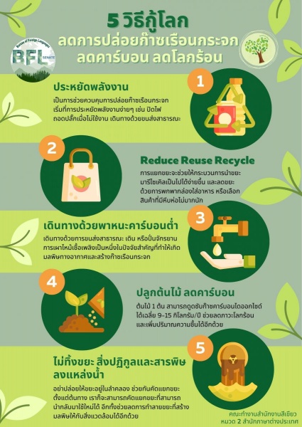 การลดการใช้พลังงานเป็นหนึ่งในวิธีที่สำคัญในการลดการปล่อยคาร์บอนได้อย่างมีประสิทธิภาพ โดยการลดการใช้พลังงานจะช่วยลดการใช้เชื้อเพลิงที่เกิดคาร์บอนไดออกไซด์ในกระบวนการผลิตพลังงาน นี่คือบางวิธีที่สามารถลดการใช้พลังงานเพื่อลดคาร์บอนได้ 1. การปรับปรุงประสิทธิภาพของอุปกรณ์: อัปเกรดหรือเปลี่ยนอุปกรณ์ที่ใช้พลังงานให้เป็นรุ่นที่มีความมีประสิทธิภาพสูง ตัวอย่างเช่น ใช้หลอดไฟ LED , เลือกใช้เครื่องใช้ไฟฟ้าที่มีการใช้พลังงานอย่างประหยัด ฉลากเบอร์5, และตรวจสอบและซ่อมแซมอุปกรณ์ที่รั่วไหลที่อาจก่อให้เกิดการสูญเสียพลังงาน 2. การจัดการพลังงานในบ้าน: ปรับเปลี่ยนพฤติกรรมการใช้พลังงานภายในบ้าน เช่น ปิดไฟเมื่อไม่ได้ใช้งาน, ปิดเครื่องใช้ไฟฟ้าเมื่อไม่ใช้งาน, ใช้ตัวควบคุมอัจฉริยะที่ช่วยลดการใช้พลังงานของเครื่องใช้ไฟฟ้า เช่น ตั้งเวลาการทำงานของเครื่องปรับอากาศให้เปิด-ปิดอัตโนมัติ 3. การใช้พลังงานทดแทน: การเลือกใช้แหล่งพลังงานที่เป็นมิตรกับสิ่งแวดล้อม เช่น การติดตั้งแผงโซลาร์เซลล์เพื่อผลิตไฟฟ้าจากพลังงานแสงอาทิตย์, การใช้ระบบผลิตไฟฟ้าทางลม เป็นต้น นอกจากนี้ยังสามารถเลือกใช้พลังงานทดแทนในการขนส่ง เช่น การใช้รถยนต์ไฟฟ้าหรือรถยนต์ไฮบริด 4. การลดการใช้ยานพาหนะส่วนตัว: พิจารณาใช้ยานพาหนะสาธารณะหรือยานพาหนะที่มีการใช้พลังงานที่มีประสิทธิภาพสูงเมื่อไม่จำเป็นต้องใช้รถส่วนตัว นอกจากนี้ยังสามารถขับรถด้วยการใช้วิธีการอื่น ๆ หากเป็นระยะทางใกล้หรือไม่มีความจำเป็นเร่งด่วนเช่น ใช้รถจักรยานหรือเดินเป็นต้น 5. การลดการใช้พลาสติก: ลดการใช้งานและการทิ้งของพลาสติก ใช้ถุงผ้าหรือถุงที่สามารถนำกลับมาใช้ได้แทนถุงพลาสติก และปรับปรุงการจัดการขยะให้เกิดการรีไซเคิลเพื่อลดการสร้างขยะพลาสติกที่ไม่จำเป็น 6. การส่งเสริมการอยู่ร่วมกัน: สนับสนุนและเข้าร่วมกิจกรรมหรือโครงการที่ส่งเสริมการอยู่ร่วมกัน เช่น การใช้รถร่วมกัน, การแบ่งปันพื้นที่ทำงานหรือที่อยู่ เพื่อลดการเดินทางและการใช้พลังงานในการขนส่ง