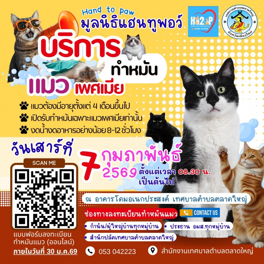 ด้วยมูลนิธิแฮนด์ ทู พอว์ เพื่อสุนัขและแมว (Hand To Paw) ซึ่งเป็นมูลนิธิช่วยเหลือ ดูแลรักษาสุนัขและแมวจรจัด ได้จัดทำโครงการลดจำนวนสุนัขและแมวในพื้นที่จังหวัดเชียงใหม่ ทั้งนี้ กำหนดจัดหน่วยให้บริการผ่าตัดทำหมันแมวเพศเมีย เคลื่อนที่โดยไม่มีค่าใช้จ่าย