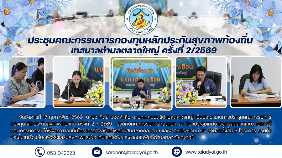วันอังคารที่ 17 กุมภาพันธ์ 2569 นายอาทิตย์ ยอดคำลือ นายกเทศมนตรีตำบลตลาดใหญ่ เป็นประธานในการประชุมคณะกรรมการกองทุนหลักประกันสุขภาพท้องถิ่น ครั้งที่ 2 / 2568 ร่วมกับคณะกรรมการกองทุนฯ ณ ห้องประชุมเทศบาลตำบลตลาดใหญ่