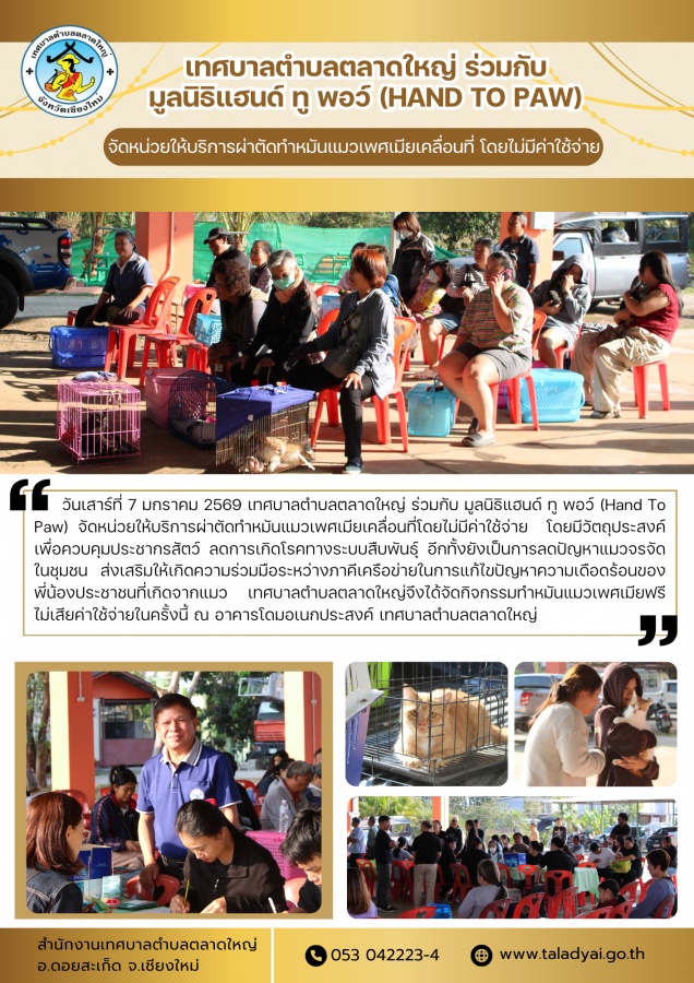 วันเสาร์ที่ 7 มกราคม 2569 เทศบาลตำบลตลาดใหญ่ ร่วมกับ มูลนิธิแฮนด์ ทู พอว์ (Hand To Paw) จัดหน่วยให้บริการผ่าตัดทำหมันแมวเพศเมียเคลื่อนที่ โดยไม่มีค่าใช้จ่าย โดยมีวัตถุประสงค์เพื่อควบคุมประชากรสัตว์ ลดการเกิดโรคทางระบบสืบพันธุ์ อีกทั้งยังเป็นการลดปัญหาแมวจรจัดในชุมชน ส่งเสริมให้เกิดความร่วมมือระหว่างภาคีเครือข่ายในการแก้ไขปัญหาความเดือดร้อนของพี่น้องประชาชนที่เกิดจากแมว