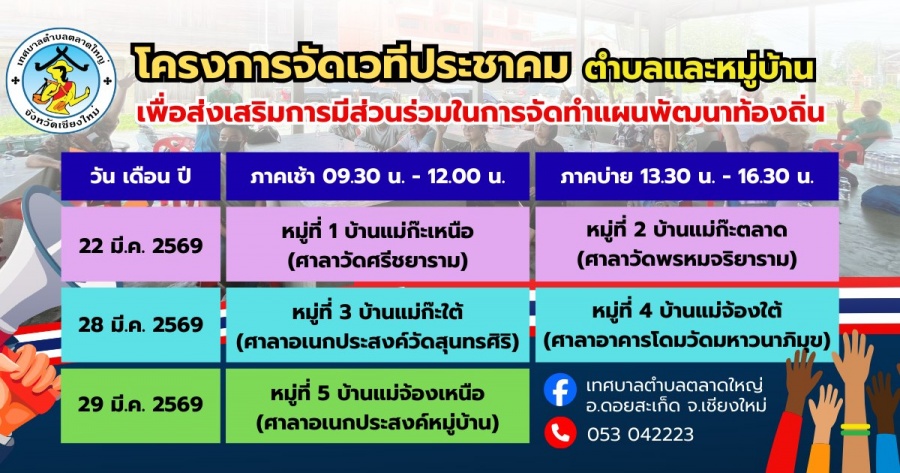 ดังนั้น เพื่อให้การดำเนินการตามโครงการจัดเวทีประชาคมตำบลและหมู่บ้าน เป็นไปด้วยความเรียบร้อยตามวัตถุประสงค์และแสร็จสิ้นตามระยะเวลา ที่กำหนด จึงขอเชิญประชาชนในตำบลตลาดใหญ่ เข้าร่วมโครงการดังกล่าวตามวันเวลาที่กำหนด