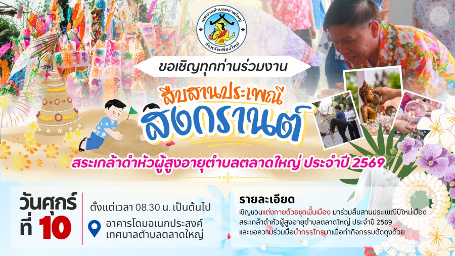 ขอเชิญชวนทุกท่านเข้าร่วมกิจกรรมสระเกล้าดำหัว พระเถรานุเถระ ผู้สูงอายุและผู้ใหญ่ที่เคารพนับถือ โครงการจัดงานประเพณีสงกรานต์ (ปี๋ใหม่เมือง) ประจำปีงบประมาณ 2569