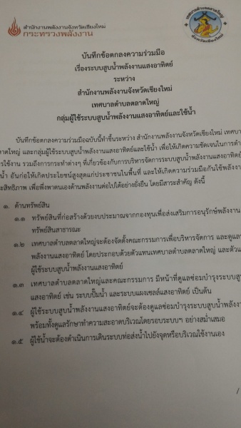 15 กุมภาพันธ์ 2560 เทศบาลตำบลตลาดใหญ่ โดย ว่าที่ ร.ต.มนัส กันธะทา ลงนามความร่วมมือในการดำเนินงานระบบสูบน้ำพลังงานแสงอาทิตย์ ร่วมกับ สำนักงานพลังงานจังหวัดเชียงใหม่