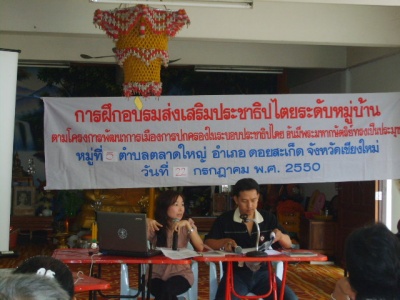 เมื่อวันที่ 22 กรกฎาคม 2550 เวลา 09.00 น. ณ วัดมหาวนาภิมุข ต. ตลาดใหญ่ อ.ดอยสะเก็ด จ.เชียงใหม่ ทีมงานชุดปฏิบัติการขยายผลระดับตำบล นำโดยนายอัฐ ชัยมงคล ปลัดองค์การบริหารส่วนตำบลตลาดใหญ่และคณะทำงานลงพื้นที่ให้ความรู้ประชาชนหมู่ที่ 5 บ้านแม่จ้องเหนือ เป็นหมู่บ้านสุดท้ายที่ดำเนินการตามโครงการพัฒนาการเมืองการปกครองในระบอบประชาธิปไตยอันมีพระมหากษัตริย์ทรงเป็นประมุข ปี 2550 และผลการดำเนินการเป็นไปด้วยความเรียบร้อย