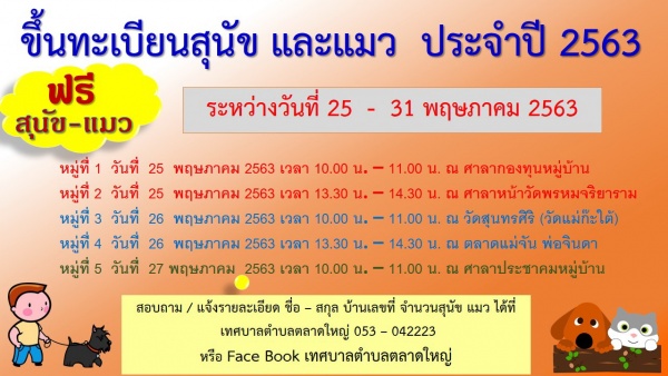 เทศบาลตำบลตลาดใหญ่ขึ้นทะเบียน สุนัข - แมว ประจำปี 2563