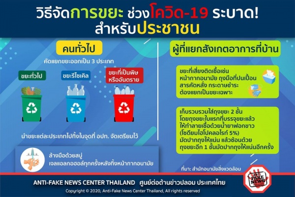นอกจากจะต้องดูแลตัวเอง รักษาสุขภาพไม่ให้ติดเชื้อโควิด-19 หรือไม่ออกนอกบ้านโดยไม่จำเป็นแล้ว การจัดการ การแยกขยะก็มีส่วนช่วยในการลดการแพร่เชื้อโควิดสู่สาธารณะ โดยแยกขยะที่เสี่ยงติดเชื้อออกจากขยะปกติ ซึ่งสามารถทำได้โดยง่ายด้วยตัวเอง เช่น . 1. แยกขยะทั่วไปออกเป็น 3 ประเภท 2. ขยะที่เสี่ยงติดเชื้อ เช่น หน้ากากอนามัย ถุงมือที่ปนเปื้อนสารคัดหลั่ง กระดาษชำระ ต้องแยกเป็นขยะเฉพาะ เก็บรวบรวมใส่ถุงขยะ 2 ชั้น โดยถุงขยะใบแรกที่บรรจุขยะแล้วให้ทำลายเชื้อด้วยน้ำยาฟอกขาว (โซดียมไฮโปคลอไรท์ 5%) มัดปากถุงให้แน่น แล้วซ้อนด้วย ถุงขยะอีก 1 ชั้นมัดปากถุงให้แน่นอีกครั้ง 3. ลดการเสี่ยงติดเชื้อโดยการพับหรือมัดส่วนที่ติดเชื้อให้อยู่ด้านใน 4. นำขยะไปทิ้งในจุดที่ อปท. รวบรวมไว้เท่านั้น 5. ปิดหรือมัดถุงขยะให้สนิท 6. ล้างมือด้วยสบู่ เจลแอลกอฮอล์ทุกครั้งหลังทิ้งหน้ากากอนามัย . ที่มา : สำนักอนามัยสิ่งแวดล้อม