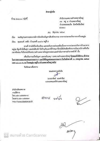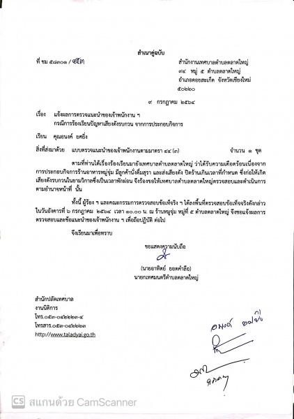 ตามที่ได้รองเรียน และขอความช่วยเหลือเนื่องจากการปรกอบกิจการร้านอาหารหมู่จุ่ม มีลูกค้านั่งดื่มสุรา และส่งเสียงดัง ปิดร้านเกินเวลาที่กำหนด ซึ่งก่อให้เกิดเสียงรบกวนในยามวิกาลซึ่งเป็นเวลาพักผ่อน จึงร้องขอให้เทศบาลตำบลตลาดใหญ่ตรวจสอบและดำเนินการตามอำนวจหน้าที่ แบบตรวจแนะนําของเจ้าพนักงานตามมาตรา ๔๔ (๓) แห่งพระราชบัญญัติการสาธารณสุข พ.ศ. ๒๕๓๕ วันที่ 5 เดือน กรกฎาคม พ.ศ. ๒๕๖๔ ข้อแนะนํา (เพื่อการปรับปรุงแก้ไข) โดยให้ดำเนินการตั้งแต่วันที่ให้ถ้อยคําเป็นต้นไป (๑) ให้ดำเนินการ และถือปฏิบัติตามคำสั่งคณะกรรมการโรคติดต่อจังหวัดเชียงใหม่ ที่ ๗๐/๒๕๖๔ เรื่อง มาตรการควบคุมส่วนบุคคลในการบริโภคสุรา หรือเครื่องดื่มที่มีแอลกอฮอล์ในร้านและบริเวณ ต่อเนื่อง ลงวันที่ ๕ กรกฎาคม ๒๕๖๔ ห้ามผู้ใดบริโภคเครื่องดื่มที่มีแอลกอฮอล์ในร้านอาหารหรือเครื่องดื่มและบริเวณต่อเนื่อง ตั้งแต่ เวลา ๒๑.๐๐ นาฬิกา เป็นต้นไป (๒) ให้ทำการปิดประกาศ กรุณาอย่าส่งเสียงดัง ภายในบริเวณร้าน (๓) แจ้งให้ลูกค้าทราบถึง คำสั่งคณะกรรมการโรคติดต่อจังหวัดเชียงใหม่ ที่ ๗๐/๒๕๖๔ เรื่อง มาตรการควบคุมส่วนบุคคลในการบริโภคสุรา หรือเครื่องดื่มที่มีแอลกอฮอล์ในร้านและบริเวณ ต่อเนื่อง ลงวันที่ ๕ กรกฎาคม ๒๕๖๔ พร้อมทั้งปิดคำสั่ง ฯ ดังกล่าว ภายในบริเวณร้าน (๔) ให้ทั้งสองฝ่ายพูดคุย ประนีประนอม บอกกล่าวๆ กัน เพื่อร่วมกันแก้ไขปัญหา ๕. หากท่านมิได้ปรับปรุงแก้ไขตามคำแนะนำของเจ้าพนักงานท้องถิ่น อาศัยอำนาจมาตรา ๒๘ แห่ง พระราชบัญญัติการสาธารณสุข พ.ศ.๒๕๓๕ เจ้าพนักงานท้องถิ่นมีอำนาจออกคำสั่งให้ท่านปรับปรุงแก้ไข และระงับเหตุรำคาญ นับแต่วันที่ได้รับคำสั่งนั้นหากไม่ปฏิบัติตามคำสั่งภายในระยะเวลาดังกล่าว จะมีโทษ จำคุกไม่เกิน 6 เดือนหรือปรับไม่เกิน 5,000 บาทหรือทั้งจำทั้งปรับ ตามมาตรา ๗๔ ทั้งนี้ ทั้ง ๒ ฝ่าย ได้แก่ ผู้ร้อง ฯ และผู้ประกอบการ ฯ ได้รับทราบ เข้าใจ และตกลงร่วมกัน ตามแนวทางการแก้ไขปัญหา และยึดถือตามแบบตรวจแนะนำของเจ้าพนักงานตามมาตรา ๔๔