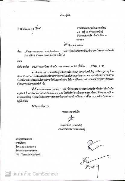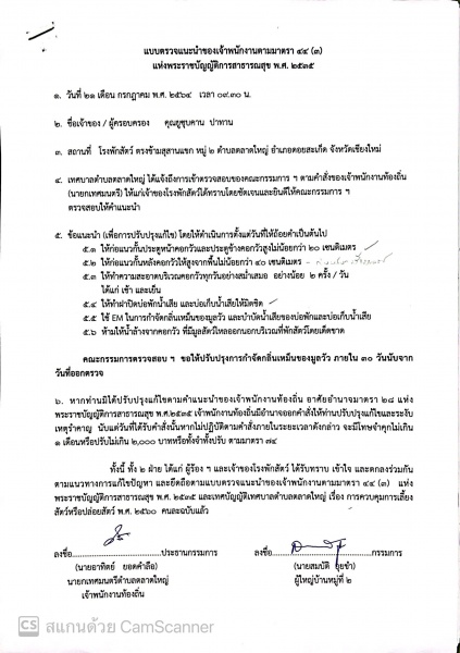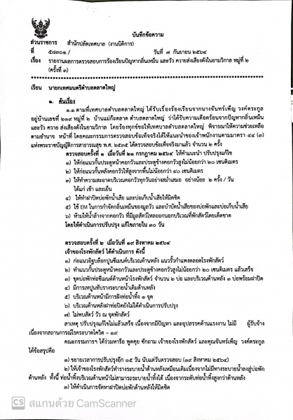 เนื่องจากทางเทศบาลได้รับแจ้งร้องเรียนปัญหากลิ่นเหม็น และวัว ควาย ส่งเสียงดังในยามวิกาล โดยร้องทุกข์ขอให้เทศบาลตำบล ตลาดใหญ่ พิจารณาให้ความช่วยเหลือตามอำนาจหน้าที่ โดยให้ความช่วยเหลือ ตามอำนาจ หน้าที่ โดยคณะกรรมการตรวจสอบข้อเท็จจริงได้ให้แนะนำของเจ้าพนักงานตามมาตรา ๔๔ (๓) แห่งพระราชบัญญัติการสาธารณสุข พ.ศ. ๒๕๓๕ ได้ตรวจสอบข้อเท็จจริงมาแล้ว จำนวน ๒ ครั้ง ตรวจสอบครั้งที่ 2 เมื่อวันที่ ๒๑ กรกฎาคม ๒๕๖๔ ให้คำแนะนำ ปรับปรุงแก้ไข ๑) ให้ก่อแนวกั้นประตูหน้าคอกวัวและประตูข้างคอกวัวสูงไม่น้อยกว่า ๒๐ เซนติเมตร ๒) ให้ก่อแนวกั้นหลังคอกวัวให้สูงจากพื้นไม่น้อยกว่า ๔๐ เซนติเมตร ๓) ให้ทำความสะอาดบริเวณคอกวัวทุกวันอย่างสม่ำเสมอ อย่างน้อย 5 ครั้ง / วัน ได้แก่ เช้า และเย็น ๔) ให้ทําฝาปิดบ่อพักน้ำเสีย และบ่อเก็บน้ำเสียให้มิดชิด ๕) ใช้ EM ในการกำจัดกลิ่นเหม็นของมูลวัว และบำบัดน้ำเสียของบ่อพักและบ่อเก็บน้ำเสีย 5) ห้ามให้น้ำล้างจากคอกวัว ที่มีมูลสัตว์ไหลออกนอกบริเวณที่พักสัตว์โดยเด็ดขาด โดยให้ดำเนินการปรับปรุง แก้ไขภายใน ๓๐ วัน ตรวจสอบครั้งที่ 2 เมื่อวันที่ ๑๙ สิงหาคม ๒๕๖๔ เจ้าของโรงพักสัตว์ ได้ดำเนินการ ดังนี้ ๑) ก่อแนวอิฐบล็อกปูนซีเมนต์บริเวณด้านหลัง แนวรั้วกำแพงตลอดโรงพักสัตว์ ๒) ทำแนวกั้นประตูหน้าคอกวัวและประตูข้างคอกวัวสูงไม่น้อยกว่า ๒๐ เซนติเมตร แล้วเสร็จ ๓) ขุดบ่อพักท่อซีเมนต์ด้านหน้าโรงพักสัตว์ จำนวน ๒ บ่อ และบริเวณด้านหลัง ๑ บ่อพร้อมฝาปิด ๔) มีการเทปูนทับรางระบายน้ำเดิมด้านหลัง ๕) บริเวณด้านหน้ามีการฝังท่อน้ำทิ้ง 9 จุด 5) บริเวณด้านหลังฝาท่อปิดยังไม่ได้ดำเนินการปรับปรุง ๗) ไม่พบสัตว์ วัว ณ จุดพักสัตว์ สาเหตุ ปรับปรุงแก้ไขไม่แล้วเสร็จ เนื่องจากมีปัญหา และอุปสรรคด้านแรงงาน ไม่มี ผู้รับจ้าง เนื่องจากสถานการณ์โรคระบาดโควิด -๑๙ คณะกรรมการฯ ได้ร่วมหารือ พูดคุย ซักถาม เจ้าของโรงพักสัตว์ และคุณจันทร์เพ็ญ วงศ์ตระกูล ได้ข้อสรุปคือ ๑) ขยายเวลาการปรับปรุงอีก ๑๕ วัน นับแต่วันตรวจสอบ (๑๙ สิงหาคม ๒๕๖๔) ๒) ให้เจ้าของโรงพักสัตว์ทำรางระบายน้ำด้านหลังเหมือนเดิมเนื่องจากไม่มีทางระบายน้ำลงสู่บ่อพัก ด้านหลัง ทั้งนี้ ท่อน้ำทิ้งบริเวณด้านหน้าไม่สามารถระบายน้ำทิ้งได้ เนื่องจากระดับท่อน้ำทิ้งสูงกว่าด้านหลัง ๓) ให้คําเนินการจัดหาฝาปิดบ่อพักด้านหลังให้มิดชิด