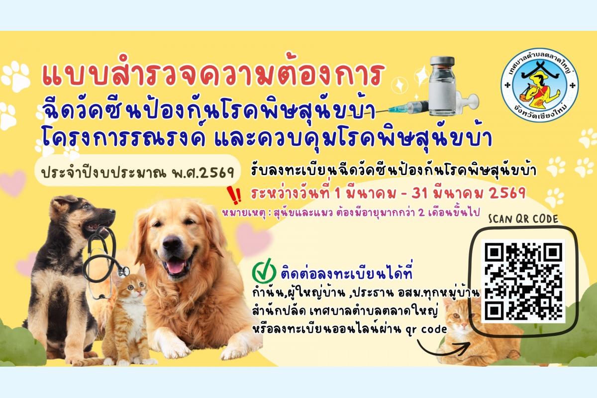 - ลงทะเบียนรับการฉีดวัคซีนป้องกันโรคพิษสุนัขบ้า สำหรับสุนัขและแมว ฟรีไม่มีค่าใช้จ่าย!! ได้ตั้งแต่วันนี้ - ถึง 31 มีนาคม 2569(02 มี.ค. 69)