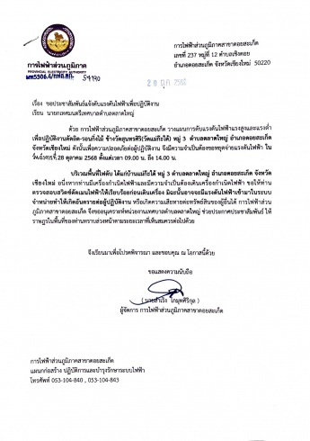 ด้วย การไฟฟ้าส่วนภูมิภาคสาขาดอยสะเก็ด วางแผนการดับแรงดันไฟฟ้าแรงสูงและแรงต่ำ เพื่อปฏิบัติงานตัดลิด-รอนกิ่งไม้ ข้างวัดสุนทรศิริ(วัดแม่ก๊ะใต้) หมู่ 3 ตำบลตลาดใหญ่ อำเภอดอยสะเก็ด จังหวัดเชียงใหม่ ดังนั้นเพื่อความปลอดภัยต่อผู้ปฏิบัติงาน จึงมีความจำเป็นต้องขอหยุดจ่ายแรงดันไฟฟ้า ใน วันอังคารที่ 28 ตุลาคม 2568 ตั้งแต่เวลา 09.00 น. ถึง 14.00 น.