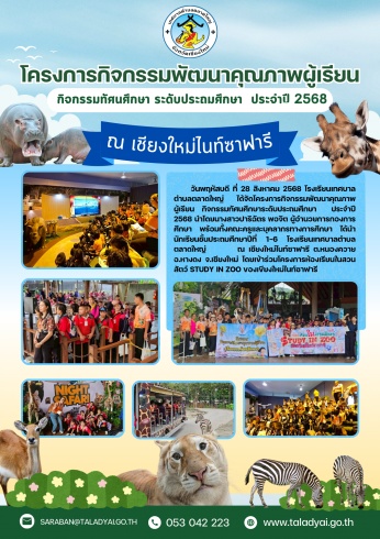 โครงการพัฒนาคุณภาพผู้เรียน กิจกรรมทัศนศึกษา ระดับประถมศึกษา โดยเข้าร่วมโครงการห้องเรียนในสวนสัตว์ Study in zoo ของเขียงใหม่ไนท์ซาฟารี <28/08/68>