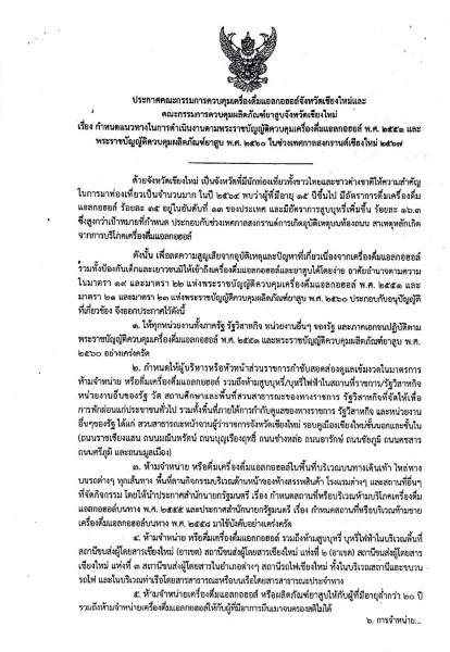 ประกาศกำหนดแนวทางในการดำเนินงานตามพระบัญญัติควบคุมเครื่องดื่มแอลกอฮอล์ พ.ศ.2551 และพระราชบัญญัติควบคุมผลิตภัณฑ์ยาสูบ พ.ศ. 2560 ในช่วงเทศกาลสงกรานต์เชียงใหม่ 2567 ระหว่างวันที่ 1-21 เมษายน 2567