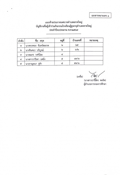 เรื่อง กำหนดการจัดกิจกรรม โรงเรียนผู้สูงอายุตำบลตลาดใหญ่ ประจำปี พ.ศ. 2567 และบัญชีรายชื่อผู้เข้าร่วมกิจกรรม โรงเรียนผู้สูงอายุตำบลตลาดใหญ่ ประจำปี พ.ศ. 2567