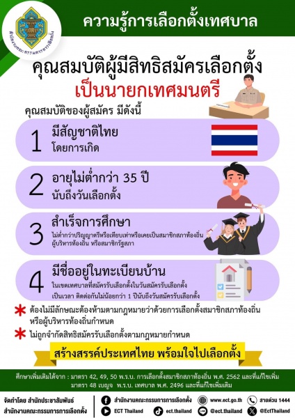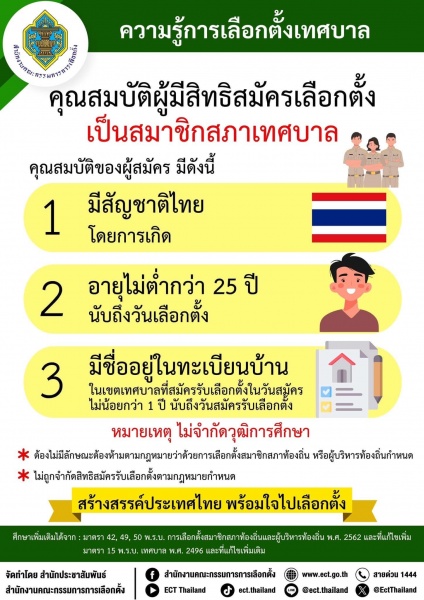 ความรู้การเลือกตั้งเทศบาลก่อนการเลือกตั้ง 2568 คุณสมบัติผู้มีสิทธิสมัครเลือกตั้งเป็นนายกเทศมนตรี คุณสมบัติผู้มีสิทธิสมัครเลือกตั้งเป็นสมาชิกสภาเทศบาล และค่าธรรมเนียมการสมัครรับเลือกตั้ง