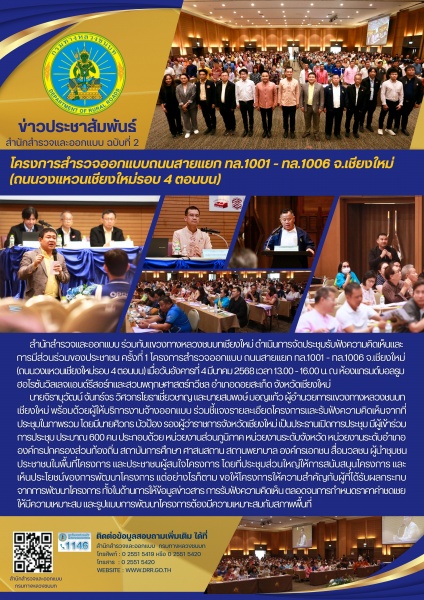 ตามที่ กรมทางหลวงชนบท สำนักสำรวจและออกแบบ ร่วมกับแขวงทางหลวงชนบทเชียงใหม่ ได้ดำเนินการจัดประชุมรับฟังความคิดเห็นและการมีส่วนร่วมของประชาชน ครั้งที่ 1 โครงการสำรวจออกแบบ ถนนสายแยก ทล.1001 - ทล.1006 จ.เชียงใหม่ (ถนนวงแหวนเชียงใหม่รอบ 4 ตอนบน) เมื่อวันอังคารที่ 4 มีนาคม 2568 เวลา 13.00 - 16.00 น. ณ ห้องแกรนด์บอลรูม ฮอไรซันวิลเลจแอนด์รีสอร์ทและสวนพฤกษศาสตร์ทวีชล อำเภอดอยสะเก็ด จังหวัดเชียงใหม่ พร้อมด้วยระบบวีดีโอคอนเฟอเรนซ์ ผ่านโปรแกรม Zoom Cloud Meeting แล้วเสร็จนั้น ในการนี้ กรมทางหลวงชนบท โดยแขวงทางหลวงชนบทเชียงใหม่ จึงขอประชาสัมพันธ์ ประกาศสรุปผลการประชุมฯ เพื่อเป็นการเผยแพร่ข้อมูลข่าวสารให้สาธารณชนรับทราบต่อไป โดยมีรายละเอียดตามเอกสารด้านล่างนี้ ท่านสามารถดูรายละเอียดเพิ่มเติมได้ตามลิงค์นี้ https://www.xn--4-5wfal1dbvabeaid7gns5db9ef8bd8omkva4dzh.com/