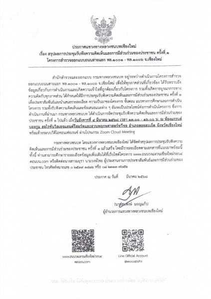 ประกาศแขวงทางหลวงชนบทเชียงใหม่ เรื่อง สรุปผลการประชุมรับฟังความคิดเห็นและการมีส่วนร่วมของประชาชน ครั้งที่ 1 โครงการสำรวจออกแบบถนนสายแยก ทล.1001 - ทล.1006 จ.เชียงใหม่