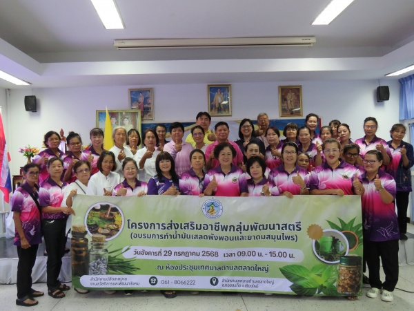 วันอังคารที่ 29 กรกฎาคม 2568 เทศบาลตำบลตลาดใหญ่ ดำเนินการจัดโครงการส่งเสริมอาชีพกลุ่มพัฒนาสตรี (อบรมการทำน้ำมันเสลดพังพอนและยาดมสมุนไพร) ประจำปี 2568 เพื่ออนุรักษ์และสืบสานภูมิปัญญาไทย สามารถนำมาใช้ดูแลสุขภาพเบื้องต้น ช่วยบรรเทาอาการต่างๆ และเสริมสร้างรายได้ให้กับตนเองและชุมชน นำโดย นายอาทิตย์ ยอดคำลือ นายกเทศมนตรีตำบลตลาดใหญ่ เป็นประธานในพิธีเปิดโครงการ และได้รับเกียรติจาก นางรัฐพรรณ สันติอโนทัย อาจารย์ประจำภาควิชาสาธารณสุขศาสตร์ คณะวิทยาศาสตร์และเทคโนโลยี มหาวิทยาลัยราชภัฏเชียงใหม่ มาเป็นวิทยากรถ่ายทอดความรู้ในกิจกรรมดังกล่าว ณ ห้องประชุมเทศบาลตำบลตลาดใหญ่