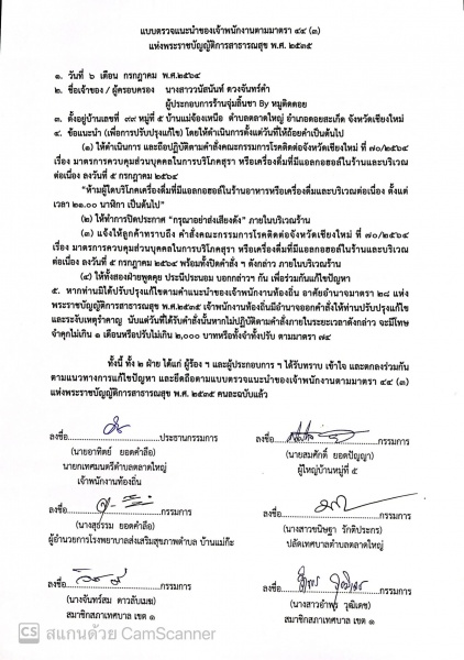 ตามที่ได้รองเรียน และขอความช่วยเหลือเนื่องจากการปรกอบกิจการร้านอาหารหมู่จุ่ม มีลูกค้านั่งดื่มสุรา และส่งเสียงดัง ปิดร้านเกินเวลาที่กำหนด ซึ่งก่อให้เกิดเสียงรบกวนในยามวิกาลซึ่งเป็นเวลาพักผ่อน จึงร้องขอให้เทศบาลตำบลตลาดใหญ่ตรวจสอบและดำเนินการตามอำนวจหน้าที่ แบบตรวจแนะนําของเจ้าพนักงานตามมาตรา ๔๔ (๓) แห่งพระราชบัญญัติการสาธารณสุข พ.ศ. ๒๕๓๕ วันที่ 5 เดือน กรกฎาคม พ.ศ. ๒๕๖๔ ข้อแนะนํา (เพื่อการปรับปรุงแก้ไข) โดยให้ดำเนินการตั้งแต่วันที่ให้ถ้อยคําเป็นต้นไป (๑) ให้ดำเนินการ และถือปฏิบัติตามคำสั่งคณะกรรมการโรคติดต่อจังหวัดเชียงใหม่ ที่ ๗๐/๒๕๖๔ เรื่อง มาตรการควบคุมส่วนบุคคลในการบริโภคสุรา หรือเครื่องดื่มที่มีแอลกอฮอล์ในร้านและบริเวณ ต่อเนื่อง ลงวันที่ ๕ กรกฎาคม ๒๕๖๔ ห้ามผู้ใดบริโภคเครื่องดื่มที่มีแอลกอฮอล์ในร้านอาหารหรือเครื่องดื่มและบริเวณต่อเนื่อง ตั้งแต่ เวลา ๒๑.๐๐ นาฬิกา เป็นต้นไป (๒) ให้ทำการปิดประกาศ กรุณาอย่าส่งเสียงดัง ภายในบริเวณร้าน (๓) แจ้งให้ลูกค้าทราบถึง คำสั่งคณะกรรมการโรคติดต่อจังหวัดเชียงใหม่ ที่ ๗๐/๒๕๖๔ เรื่อง มาตรการควบคุมส่วนบุคคลในการบริโภคสุรา หรือเครื่องดื่มที่มีแอลกอฮอล์ในร้านและบริเวณ ต่อเนื่อง ลงวันที่ ๕ กรกฎาคม ๒๕๖๔ พร้อมทั้งปิดคำสั่ง ฯ ดังกล่าว ภายในบริเวณร้าน (๔) ให้ทั้งสองฝ่ายพูดคุย ประนีประนอม บอกกล่าวๆ กัน เพื่อร่วมกันแก้ไขปัญหา ๕. หากท่านมิได้ปรับปรุงแก้ไขตามคำแนะนำของเจ้าพนักงานท้องถิ่น อาศัยอำนาจมาตรา ๒๘ แห่ง พระราชบัญญัติการสาธารณสุข พ.ศ.๒๕๓๕ เจ้าพนักงานท้องถิ่นมีอำนาจออกคำสั่งให้ท่านปรับปรุงแก้ไข และระงับเหตุรำคาญ นับแต่วันที่ได้รับคำสั่งนั้นหากไม่ปฏิบัติตามคำสั่งภายในระยะเวลาดังกล่าว จะมีโทษ จำคุกไม่เกิน 6 เดือนหรือปรับไม่เกิน 5,000 บาทหรือทั้งจำทั้งปรับ ตามมาตรา ๗๔ ทั้งนี้ ทั้ง ๒ ฝ่าย ได้แก่ ผู้ร้อง ฯ และผู้ประกอบการ ฯ ได้รับทราบ เข้าใจ และตกลงร่วมกัน ตามแนวทางการแก้ไขปัญหา และยึดถือตามแบบตรวจแนะนำของเจ้าพนักงานตามมาตรา ๔๔