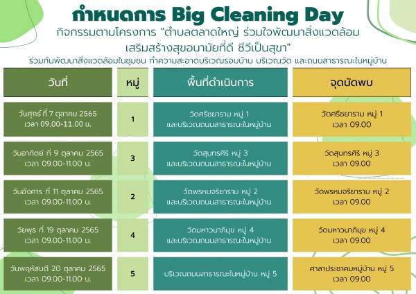 ขอเชิญชวนพี่น้องตำบลตลาดใหญ่ทุกท่าน เข้าร่วม กิจกรรม Big Cleaning Day รวมพลัง ๕ ชุมชน เพื่อคนตลาดใหญ่ ร่วมใจพัฒนาสิ่งแวดล้อมดี ชีวีเป็นสุข