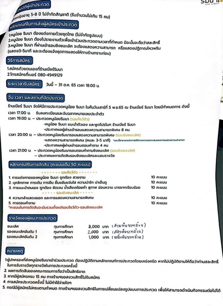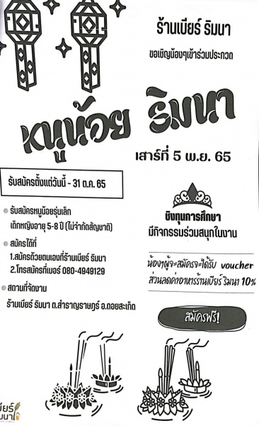 ประกาศ ขอเชิญเด็กหญิง อายุ5-8ปี(ไม่จำกัดสัญชาติ) เข้าร่วมประกวด หนูน้อยนพมาศ ภายใต้คอนเซ็ปต์ \"หนูน้อย ริมนา\" ณ ร้านเบียร์ ริมนา เบียร์ ริมนา รับจำนวนจำกัด สมัครได้ตั้งแต่วันนี้ - ถึง30ตุลาคมนี้ ชิงเงินรางวัลชนะเริศ 3,000 บาท
